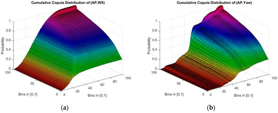 Cumulative copula distribution of the two parameters. In both figures, X and Y axis represent the bins in [0, 1] and Z axis shows the probability distribution of the copula distribution of the two parameters. In (a), the two parameters are active power and wind speed; while in (b) the two parameters are active power and yaw.