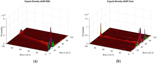 The copula density of (AP, WS) in Figure 5 is the observations of each parameter with the Z axis as the probability value. The distribution of AP and WS proves that the empirical copula process does not change the original information and maintains the physical meaning. Hence, the mutual information estimation can be used as a reference for parameter selection. Moreover, from Figure 5, it can be observed that the probability of copula (AP, Yaw) is much smaller than that of copula (AP, WS). This corresponds to the final result that wind speed ranks higher than yaw in the suggestion list. Since in this work only the components of a wind turbine are taken into consideration, the suggestion list shown in the following table only provides a rank of parameters related to the sub components.