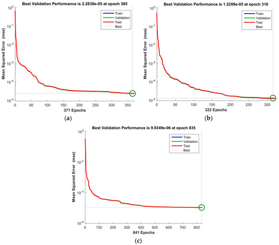 Best validation performance with three approaches through NN training process. While (a) represent the result based on the PCCA list; (b) shows the result based on the KCCA list; (c) displays the result based on the ECMI list.