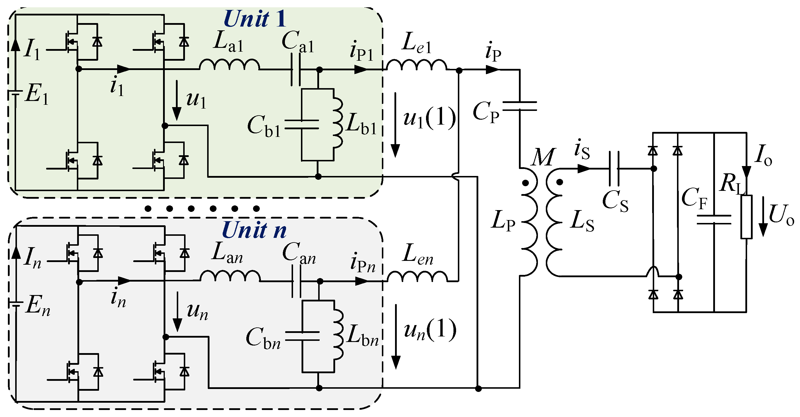 In practice, it is unlikely for the parallel unit to be identical. Generally speaking, the tolerance of the commercial inductor can be as high as 20%, and so is the capacitor [11]. For simplicity, assuming the series-parallel resonant tank is identical, only the tolerance of the connection inductors and the difference of the output inverter fundamental voltages are taken into consideration. According to Figure 5, based on the Kirchhoff’s voltage and current laws (KVL and KCL), we have: