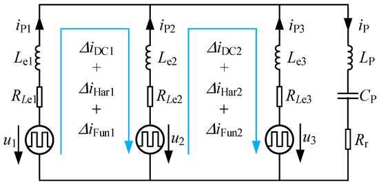 Compared to the inductive reactance (, and ), the resistance of the connection inductors (, and ) is much smaller, so that it can be neglected. Therefore, with a slight DC voltage offset difference there will be a huge DC circulating current between the parallel units [22]. Due to the tolerance of circuit parameters and the voltage difference mentioned in Equation (5), the fundamental circulating currents and , the harmonic circulating currents and between the parallel units also exist [23]. Three kinds of the circulating currents mentioned above, can be eliminated effectively by increasing the impedance of connection inductors (, and ). Nevertheless, the connection inductors will be heavy and bulky, increasing the costs and volume, and soften the characteristic of the output voltage of the inverter [31,32].