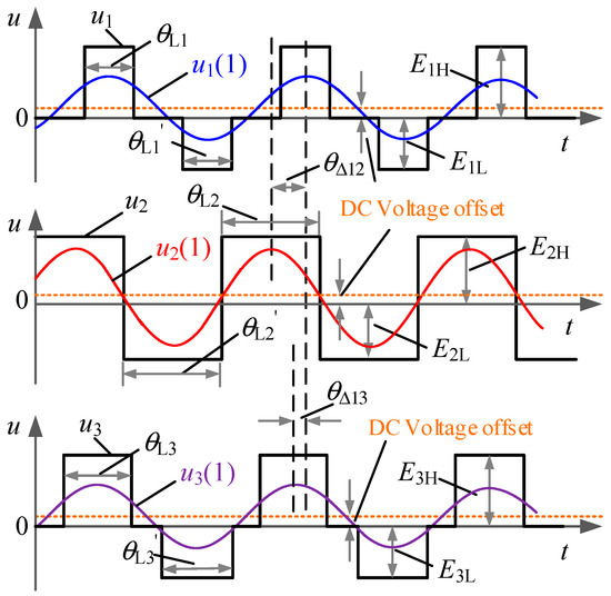 At the same time, the phase angle among the inverter 1, inverter 2 and inverter 3 can be altered accordingly. Due to the inner resistances of the inverters [22], the positive level of the inverter output voltage is not equal to the negative one (, and ). Meanwhile, the conduction angle of the positive voltage level is not equal to the negative one (, and ) due to a slight unbalance of the control signal and the speed of the switching drivers. Hence, there is a DC voltage offset in the inverter output voltage as shown in Figure 3. Meanwhile, by employing the phase shift control technology, the THD of the parallel inverter output voltage is high [10]. Therefore, the difference of the DC voltage offset , the difference of the fundamental voltage , and the difference of the harmonic voltage can be derived by: