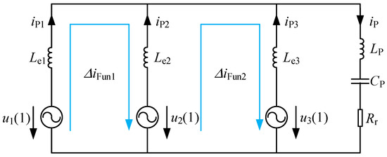 Thirdly, in order to eliminate the harmonic circulating currents and , a parallel resonant tank which can filter out the harmonic other than the fundamental component, added in the Figure 4 IPT system, as shown in Figure 1. With the series-parallel resonant tank added in the IPT system, the DC and harmonic circulating currents are eliminated effectively. To ensure that all the switches of the inverter can achieve zero-voltage switching (ZVS), the series-parallel resonant tank is well designed. The resonant frequency of the series resonant tank is tuned to a little lower than the operating frequency. In addition, the resonant frequency of the parallel resonant tank is tuned to a little higher than the operating frequency [29]. The equivalent circuit of the IPT system is shown in Figure 5 and the output voltage sources of the parallel units can be expressed only by fundamental ones. Finally, only the fundamental circulating currents and are needed to be eliminated, and it will be analyzed specifically in the next section.