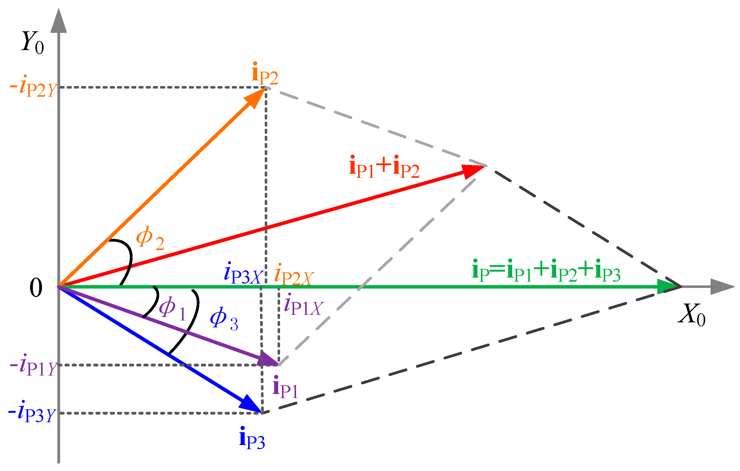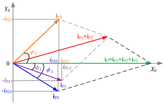 For example, let n = 3, the branch current of the parallel unit can be decomposed as shown in Figure 7. The coordinate shown in the Figure 7 consisted of X0 and Y0 is a rectangular system. To make the branch current equal, the current decomposed components in the X0 axis or in the Y0 axis, respectively, should be regulated to be equal. Besides, the Y component separately for each of the converters needs to control to be zero according to Equations (17) and (18), when the phase is zero (, ). For n-module inverter IPT system, the number of the decomposition circuits shown in Figure 6 should be n. All of the branch currents should be regulated to be equal (, ). As a result, the problem can be solved for any number of parallel connected inverters.