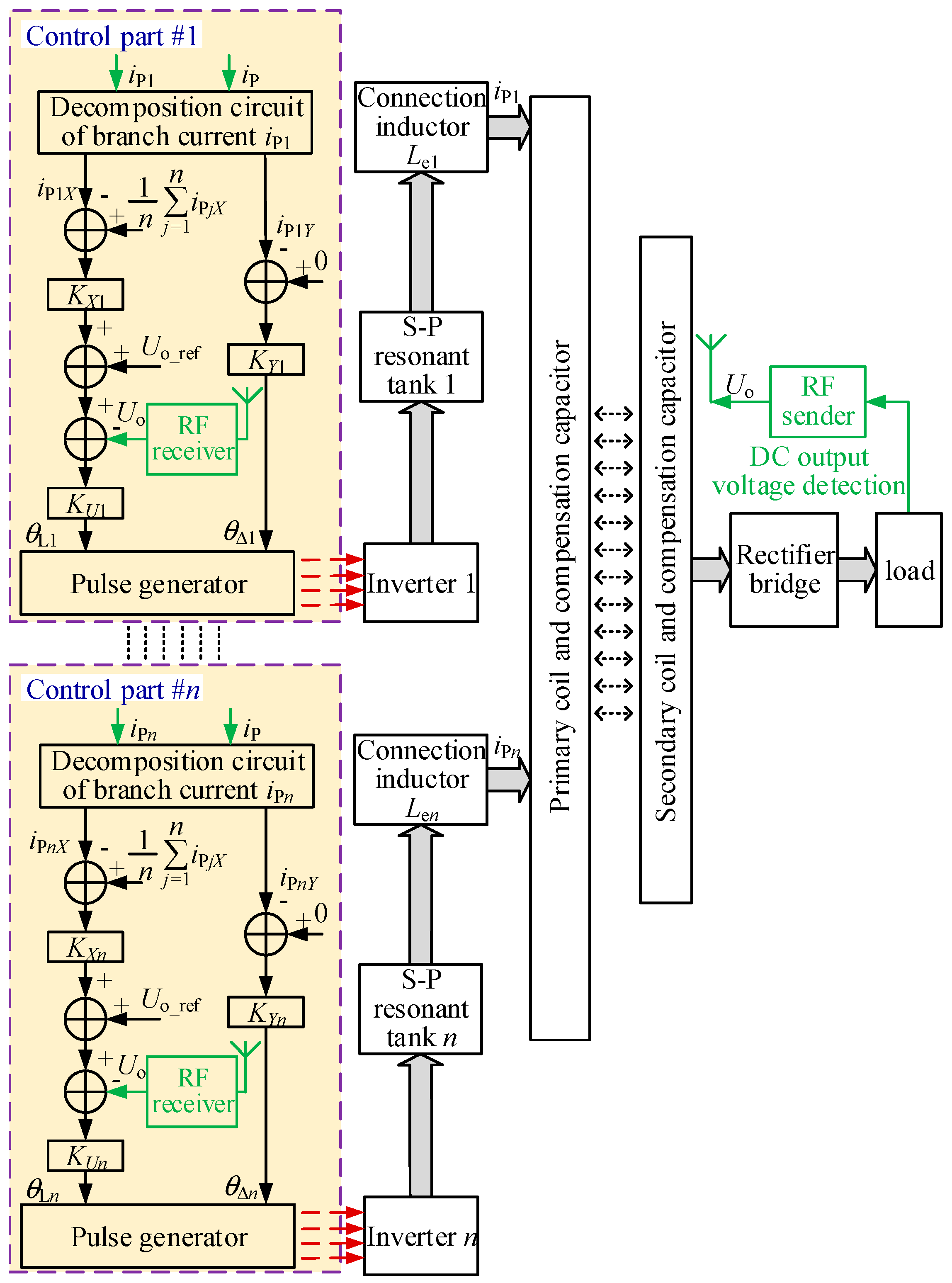 Finally, the parallel-connected inverter IPT system will work under the condition that, the magnitudes of the branch currents are controlled to be identical, the current phase differences between the parallel units are zero, and the load voltage Uo is equal to the reference voltage Uo_ref.
