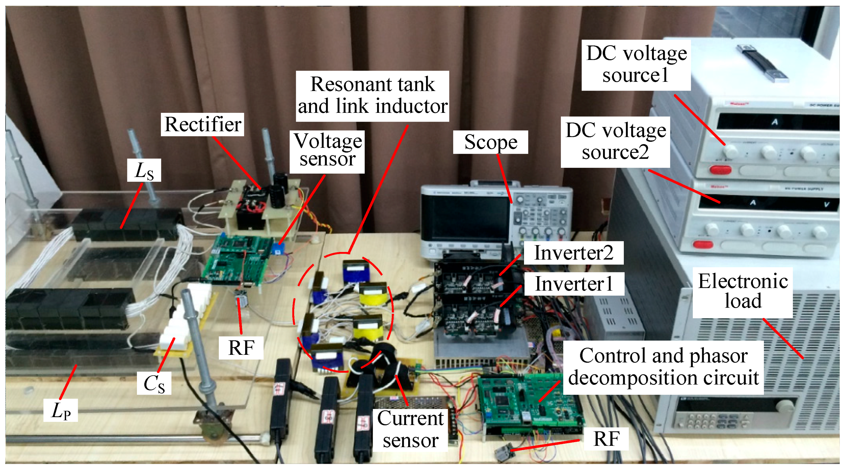 The exterior appearance of the experimental setup is portrayed in Figure 9 and the circuit parameters of the prototype are listed in Table 2. The two inverters are separately powered by two isolated DC supplies. The TMS320F28335 digital signal processing (DSP) (Texas Instruments, Dallas, TX, USA) is employed as the controller of the IPT system, and generates gate pulse signals for the inverter switching devices. The experimental waveforms are measured and displayed by Agilent MSO-X 4034A scope (Agilent, Palo Alto, CA, USA).