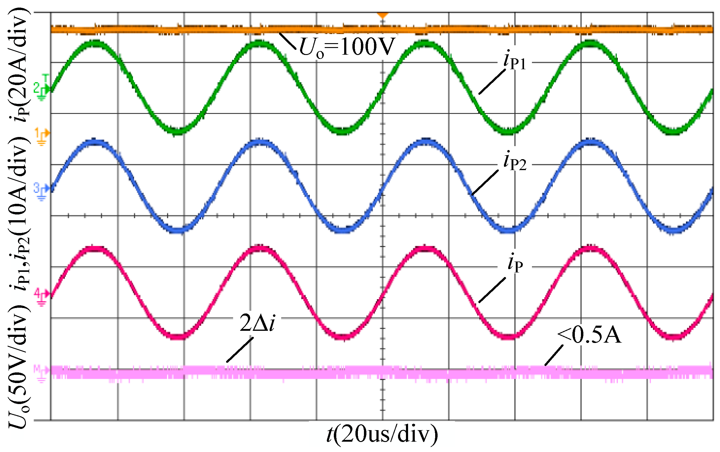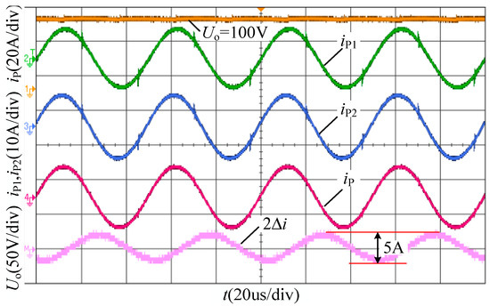 The connection inductance Le1 = 1.2 Le, Le2 = 0.8 Le, Le = 50 μH, the input DC voltages E1 = 1.15 E2 = 115 V and the reference load output voltage Uo_ref = 100 V. The steady-state current waveforms without the current phasor control but with the constant voltage control are shown in Figure 10. By fixing the phase angles and regulating the conduction angles ( = ), the output load voltage is controlled to be 100 V as same as the reference voltage Uo_ref. However, there is a large difference between the branch currents iP1 and iP2, which is shown in the bottom waveform of Figure 10 the magnitude of the twice circulating current is 5 A. With the output voltage and current ( and ), the DC input voltages (E1 and E2), and the DC input currents (I1 and I2), the efficiency of the experiment can be calculated by equation . The output power is 1 kW and the efficiency is 91.65%. Fortunately, no DC or harmonic circulating current exists, owing to the employment of the series-parallel resonant tank.