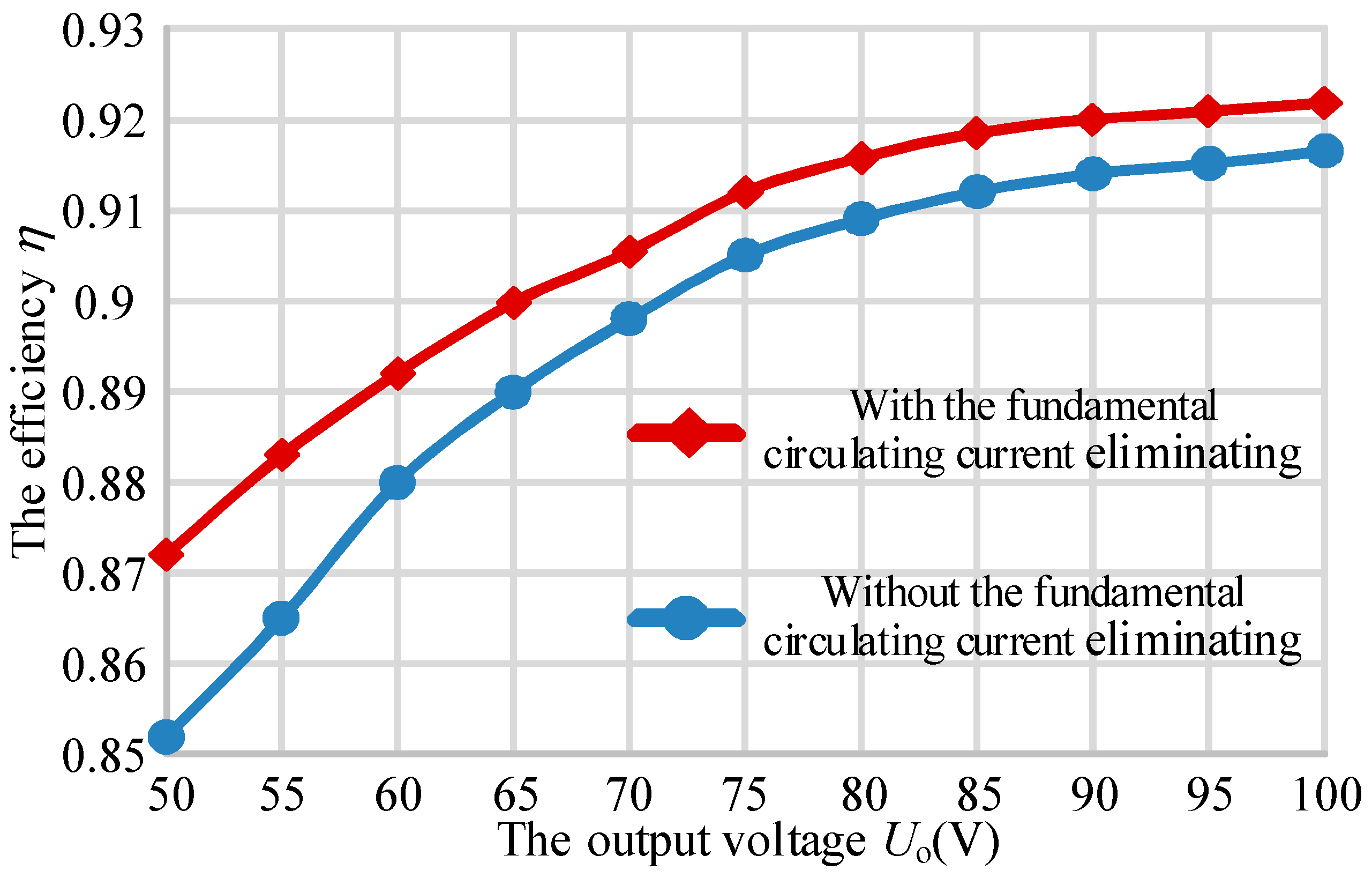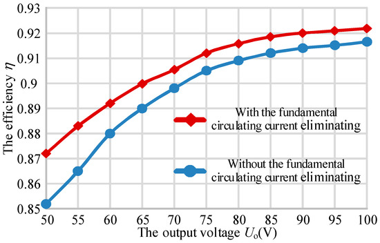 With the current phasor and constant voltage control approach applied into the IPT prototype, the circulating current between the branch currents iP1 and iP2 can be reduced effectively, and the output load voltage is controlled to be 100 V. The steady-state current waveforms are shown in Figure 11. The magnitude of the twice circulating current is less than 0.5 A, which is near one-tenth of that without the current phasor control. The efficiency of the experiment can be calculated by the equation. At the same output power (about 1 kW), the efficiency is 92.18% and is higher than that without the current phasor control (91.65%). In order to justify the statement, an efficiency comparison for the different operating point is provided in Figure 12. At the same time, no DC or harmonic circulating current exists. The experimental results verify the performance of the proposed current phasor and constant voltage control approach, which is suitable for the parallel-connected inverter IPT system.