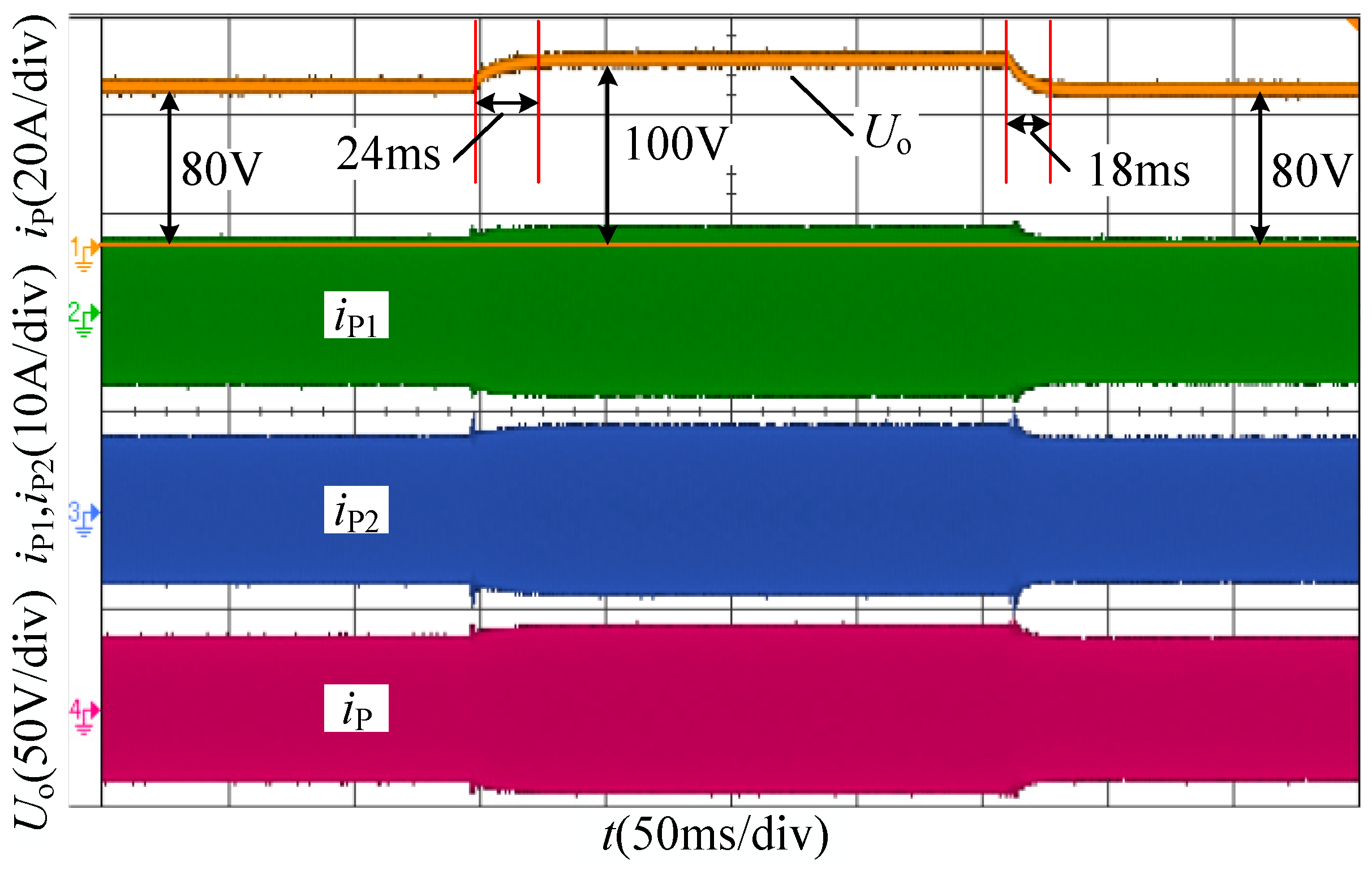 The dynamic performance during the output voltage transient is shown in Figure 13. When the reference voltage Uo_ref is stepped up from 80 to 100 V, Uo rises up quickly. The response time is about 24 ms, and there is no overshoot of the output voltage. When the reference voltage Uo_ref is stepped down from 100 to 80 V, Uo drops immediately. The response time is about 18 ms, and there is no overshoot of the output voltage too. The waveform of the output voltage is shown at the top of Figure 13. Meanwhile, the branch currents (iP1 and iP2) and the primary coil iP current are given in Figure 13.