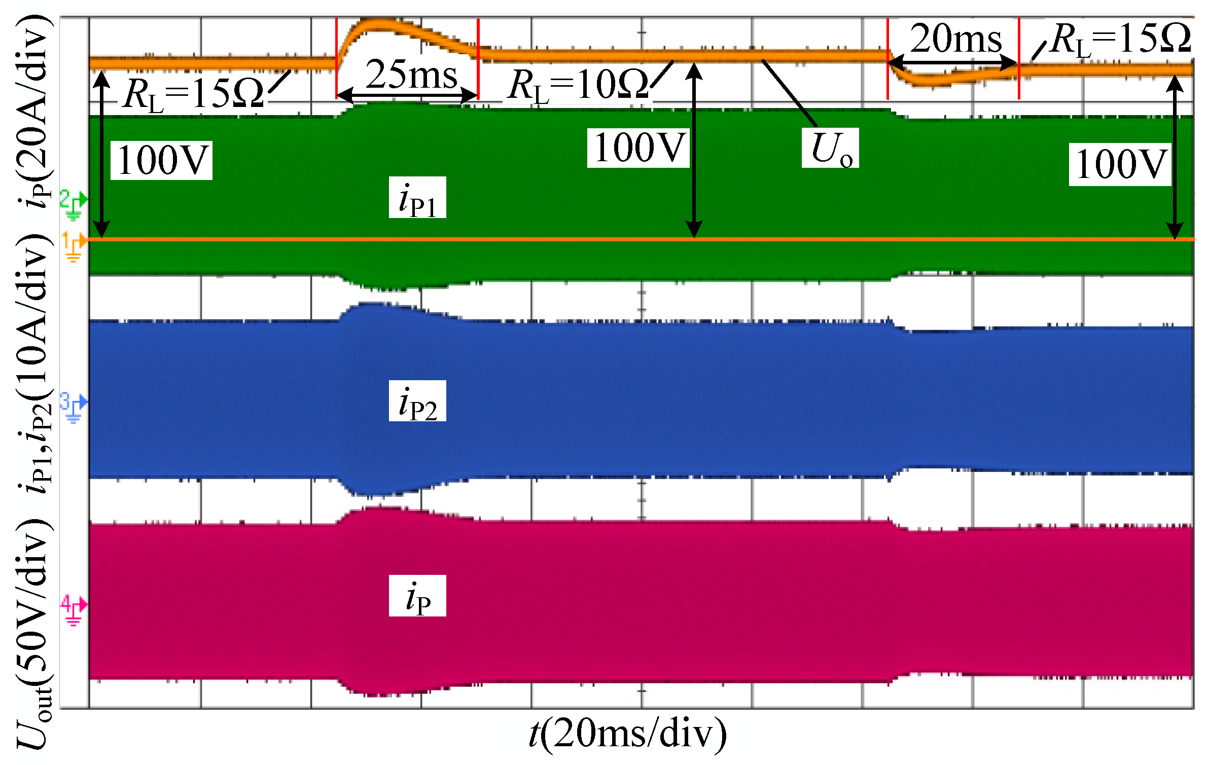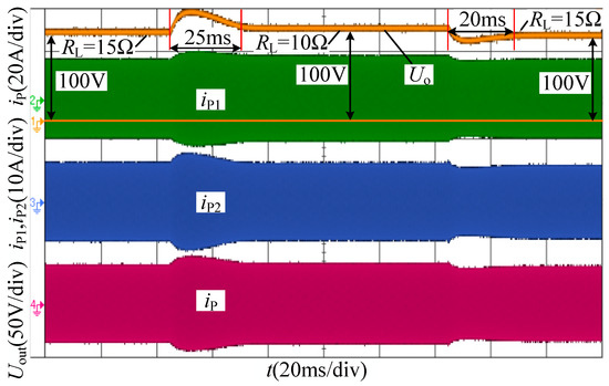 The dynamic performance during the load transient is shown in Figure 14. When the load RL is stepped down from 15 to 10 Ω, it takes a little response time (about 25 ms) to return to 100 V, and the overshoot of the output voltage Uo is small. When the load RL is stepped up from 10 to 15 Ω, it takes a bit of response time (about 20 ms) to return to 100 V, and the overshoot of the output voltage Uo is small too. The waveform of the output voltage is shown at the top of Figure 14. Meanwhile, the branch currents (iP1 and iP2) and the primary coil iP current are given in Figure 14.