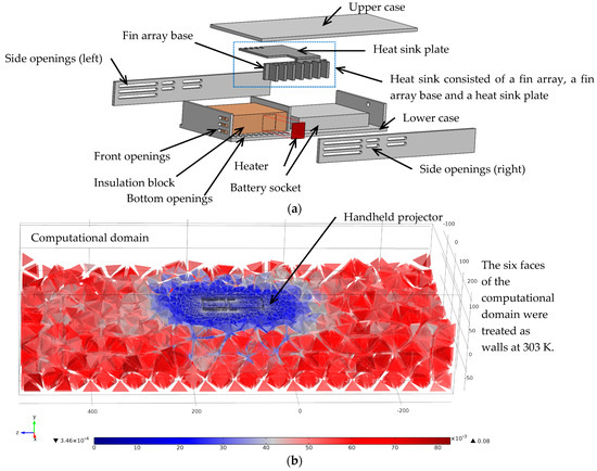 The numerical simulation with a handheld projector being centrally located in an 840 mm × 371 mm × 209 mm computational domain as shown in Figure 1b was performed in this study using commercially available software, COMSOL 5.1. The 3-dimensional numerical simulation was performed based on the following assumptions and boundary conditions: