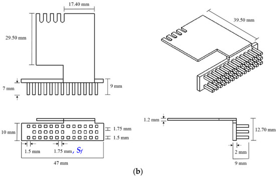 A 120 mm × 53 mm × 19 mm acrylic housing having several openings which is similar to a commercially available handheld projector (DIGI-EYE MP101, Inventec Besta, Taipei, Taiwan) was employed for the present numerical simulation as shown in Figure 1a,b. The heat-dissipating light engine in a practical handheld projector was transformed as an assembly of a 10 mm × 10 mm heater and a 47.5 × 33.5 mm × 12 mm insulation block of 0.687 W/m·K in thermal conductivity. A heat sink which is made of Al 6061 and consists of a plate-fin or pin-fin array, a rectangular fin array base and a heat sink plate extending from the fin array base as shown in Figure 2 tightly attached to the heater. Please refer to [22,23] for more detailed description of the dimension and material of all parts in the handheld projector.
