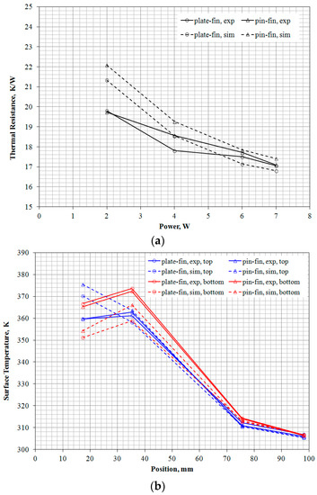 Comparison of the (a) thermal resistance at different heating powers; and (b) surface temperature distribution on both top and lower cases at 7 W, between the measured results and the simulation results.