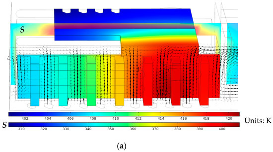 An arbitrary slice, S, which shows both the air temperature between the horizontal heat sink plate and the upper case of the handheld projector, and the air temperature around the insulation block, is also presented in Figure 5 with different temperature legend. The simulation results exhibited that the air within the spacing between the horizontal heat sink plate and the upper case of the handheld projector was almost stationary because of the tiny spacing, 1.5 mm. Therefore, conduction became the major heat transfer mode as the hot heat sink plate transferred heat across the thin air layer to the upper case, resulting in a peak temperature on the upper case surface in Figure 3b.