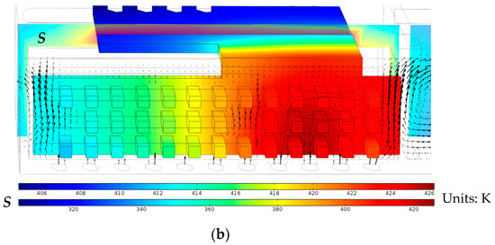The temperature distribution on the entire heat sink surface and on an arbitrary slice, S, as well as the airflow over the fin array in the primary case which has (a) 7 plates; or (b) 13 rows of pin, and 11 bottom openings on the horizontally-oriented handheld projector at a heating power of 7 W.