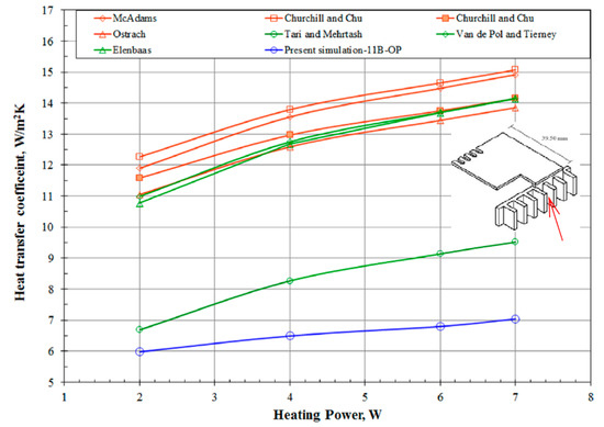 The heat transfer coefficient of one surface of the plates, which was erected above the heater and was indicated by a red arrow in the illustration in Figure 6, in the primary handheld projector at various heating powers was estimated based on its average surface temperature and heat transfer rate obtained from the simulated results. In addition, the heat transfer coefficient of a surface with identical surface temperature and dimensions to the aforementioned surface in the plate-fin array in the study was also estimated using several selected correlations. Those selected correlations are applicable for the estimation of the heat transfer coefficient of either a vertical, single plate [3,4,6] or a plate-fin array [9,11,18] in an infinite, still medium. Figure 6 demonstrates the comparison of the heat transfer coefficient among those data. It shows that the heat transfer coefficients of a single, vertical plate estimated by the correlations [3,4,6], which are presented as orange curves, were higher than those of the plate-fin array placed in an infinite medium, which are presented as green curves, because of the boundary layer interference between two adjoining fins of the plate-fin array. However, the heat transfer coefficient of the plate-fin array installed in the primary handheld projector, which ranges from 6 W/m2·K to 7 W/m2·K, is even lower than that of the plate-fin array placed in an infinite medium. The deviation between the value predicted by the correlation [18] and the present data continuously rises from 10% at 2 W to 26% at 7 W as show in Figure 6. The significant difference is likely because the case of the handheld projector and the complicated layout in the handheld projector prevent the warm air around the fin array inside the handheld projector from discharging. Note that the selected correlations used for estimating the heat transfer coefficient of a plate-fin array is applicable to the condition that the plate-fin array has to be placed in an infinite, still medium. Such negative effect on the airflow would be more pronounced as the heating power increases because the air of extremely high temperature accumulates around the fin array. Therefore, the heat transfer coefficient of the plate-fin array in the handheld projector increased in a slower rate than those predicted by the correlations in Figure 6 as the heating power increased. In fact, the heat transfer coefficient estimated by those correlations can be regarded as the upmost value that the heat transfer coefficient of the plate-fin array in the handheld projector can achieve. A better thermal design of the handheld projector achieves slighter difference in heat transfer coefficient between the value predicted by correlations and the actual heat transfer coefficient in the handheld projector.