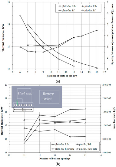 Subsequently, the effect of number of fin on the thermal resistance of the primary handheld projector was tested by gradually reducing the transverse spacing between two adjacent plates or pin rows, Sf in Figure 2, while keeping both the dimensions and the longitudinal spacing of each plate and pin indicated in Figure 2 as constants. Note that handheld projector having a fin array of either 7 plates or 13 rows of square pin was considered as the primary case. Figure 7a shows that the thermal resistance of the handheld projector having a plate-fin array reduced slightly as the number of plate increased from 7. However, as the number of plate was 9 and the spacing between plates was 2.875 mm, the thermal resistance of the handheld projector reached a minimum. Once the number of plate exceeded 9, the thermal resistance rapidly increased as the number of plate increased. The reason that causes the concave thermal resistance curve is the existence of an optimal spacing for the fin array. Although heat transfer from each plate decreases with decreasing transverse spacing, the number of fins that may be placed in a prescribed volume increases. Hence, the optimal spacing maximizes heat transfer from the array by yielding a maximum for the product of heat transfer coefficient and the total fin surface area. Figure 7a suggests that the optimal spacing between plates falls around 2.875 mm in the present plate-fin array of nonuniform temperature as the heating power is 7 W. Based on the heater temperature that the simulation results yielded at 7 W for the primary handheld projector having plate-fin array, the optimal fin spacing for the plate-fin array would be 3.3 mm and 4.3 mm, estimated by the correlation proposed in [11,14], respectively. The larger optimal spacing that the correlation predicted was because the ambient temperature was defined as the air temperature outside the projector, 303 K, which caused an overestimated Ra number used in both correlations [11,14] since the actual air temperature surrounding the fin array would be considerably higher than 303 K. Similar variation trend of the thermal resistance to the abovementioned case also occurred as the handheld projector was equipped with a pin-fin array as shown in Figure 7a. The thermal resistance slightly reduced as the row of pin fin increased from 7 to 9, which yielded a lowest thermal resistance with the spacing between pins of 3.375 mm, and then gradually increased as the pin row further increased. Although the trend of the thermal resistance variation in Figure 7 between two different handheld projectors was similar, it illustrates in Figure 7 that the thermal resistance of the handheld projector having a plate-fin array was more sensitive to the transverse spacing between fins. Figure 7a also reveals that the pin-fin array in a shrouded and narrow environment like the present handheld projector demanded a larger transverse spacing than that of a plate-fin array to obtain a comparable thermal resistance, as the natural convection was the major heat transfer mode.