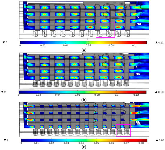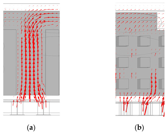 The velocity vector of the airflow within the pink rectangles in Figure 8a,f are enlarged in Figure 9a,b, respectively. In Figure 9a,b show that the airflow can not flow straight after it passes through the bottom openings because the fin shading the openings forms a barrier that causes air to deflect before it enters the passage between fins. Such airflow deflection would reduce the airflow rate through the passage between fins because the airflow at the inlet has an angle with respect to the centerline of the passage.