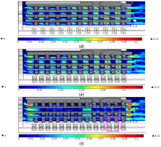 The airflow velocity contour on four sections in the fin array in the handheld projector at a heating power of 7 W, with different configurations including (a) 7-Plate, 11-Opening; (b) 7-Plate, 14-Opening; (c) 11-Plate, 14-Opening; (d) 9-Row, 11-Opening; (e) 9-Row, 14-Opening; (f) 13-Row, 14-Opening, units: m/s.