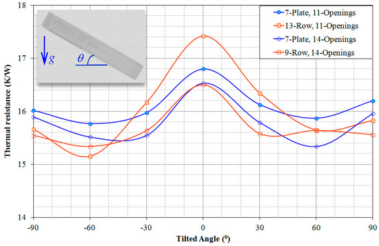Figure 10 shows the orientation effect on the thermal resistance of the handheld projector with various combinations of fins and openings, including the primary cases denoted as “7-Plate, 11-Openings” and “13-Row, 11-Openings”, and the improved designs denoted as “7-Plate, 14-Openings” and “9-Row, 14-Openings”, as well. It can be seen in Figure 9 that the thermal resistance of the handheld projector having either a plate-fin array or a pin-fin array significantly reduced as its tilted angle increased, and reached a minimum at θ = 60°. As the tilted angle of the handheld projector further increased toward θ = 90°, its thermal resistance increased. Moreover, the thermal resistance variation was almost symmetric with respect to θ = 0°. The thermal resistance of the handheld projector having a plate-fin array was lower than that having a pin-fin array at a tilted angle less than 30°, while contrary results revealed at a tilted angle of the handheld projector between 60° and 90°. The reasons that cause the thermal resistance variation with the orientation of the handheld projector are associated with the arrangement of airflow direction and the openings on the handheld projector case. The airflow field will be elucidated in Figure 11 and Figure 12 at various orientations of the handheld projector.