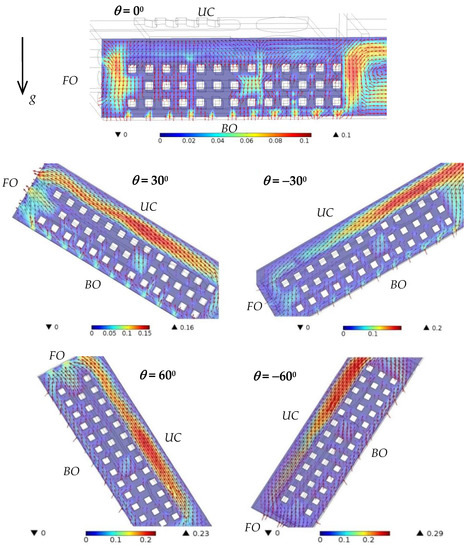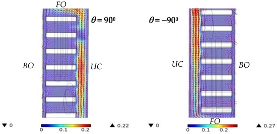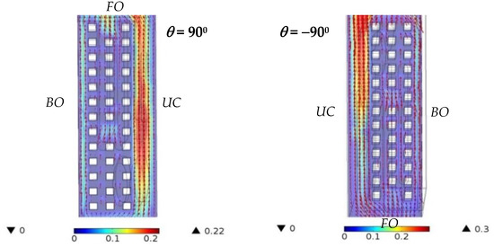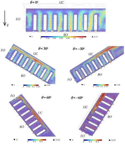 Figure 11 and Figure 12 show the airflow velocity around the fin array in the primary handheld projector with various orientations at a heating power of 7 W. The upper case of the handheld projector, the location of the bottom openings and the front openings are denoted with UC, BO and FO, respectively, in these figures for clear illustration. The white blocks, color and the arrows in these figures represent the fins, velocity magnitude and the airflow direction, respectively. As the orientation of the handheld projector was 0°, it can be observed in Figure 10 and Figure 11 that the air entered the handheld projector from every bottom opening and the lower front openings, and then moved upward through the space between fins, and finally left the handheld projector from both the side openings and front openings that were close to the upper case. As the tilted angles of the handheld projector were 30° and 60°, both figures show that not only the front openings, but those side openings close to the upper case were outlets for the airflow induced by the hot fin array, while the major inlets for the outside air were still the bottom openings. As the inclination of the handheld projector was 30° and 60°, after the air crossed the fins, it was accelerated toward the front openings with a maximum velocity around 0.15 m/s and 0.20 m/s, respectively, which was higher than the air velocity (0.08 m/s) within that region in a horizontal handheld projector. Therefore, this resulted in a lower thermal resistance of the slightly inclined handheld projector. Because the plate fins hindered the warm air from moving upward as the orientation of the handheld projector was upright (±90°), the surrounding air flowed into the handheld projector through each bottom openings was immediately discharged from the same openings. Under such circumstance, relatively small amounts of air were allowed to flow through the space between plates. However, unlike the flow situation when the tilted angle of the handheld projector was positive, the front openings became the inlets as the tilted angle of the handheld projector was negative. In addition, the air circulation adjacent to the fin located in the farthest position from the front openings would be gradually discharged from the nearby side openings, regardless of the orientation of the handheld projector.