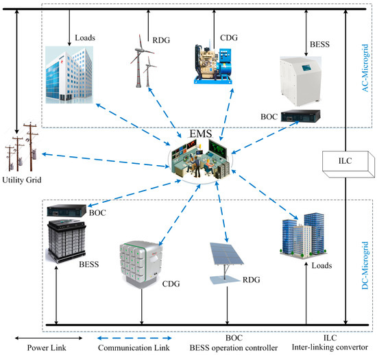 An EMS is used to schedule the resources of a microgrid and it is responsible for communication with the microgrid components [18]. Initially, AC microgrids were evolved, as the conventional power systems were dominated by the AC form [19]. Therefore, integration of renewable distributed generators (RDGs) with the conventional AC systems was widely studied [20]. Recently, DC microgrids and distribution systems are also taken into consideration due to the widespread of DC sources and loads [21]. DC microgrids allow easier integration of renewables along with the elimination of harmonic distortion and synchronization issues inherently [22]. Therefore, integration of AC and DC microgrids is proposed, and this emerges the concept of hybrid AC/DC microgrids [19]. Due to above-mentioned merits, a hybrid AC/DC microgrid is considered in this study.