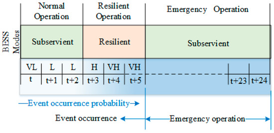 There are three inputs of the BESS operation controller, which is responsible for determining the operation mode of each BESS unit. Event occurrence probability plays a key role in determining the operation mode of BESS; therefore, the other two inputs are ignored in Figure 2. Weather-related events have increased in the past decade and are expected to increase in the future due to climate change. The prediction time regarding the occurrence of different natural/climate-related events is tabulated in [10]. National metrological agencies are responsible for initial warnings concerning weather-related events. Ground-based radars and satellite data are mostly used to monitor the global weather [23]. Once any warning is issued regarding a particular event, it is continuously monitored. Based on the speed and direction of the related parameters (wind, water, seismic activities, etc.), the probability of hitting a particular area at a given time can be expressed as very low (VL), low (L), medium (M), high (H), or very high (VH). BESS operation controller uses the membership level information of event occurrence probability along BESS SOC and market price signals to determine the operation modes of BESS units. The two possible modes suggested in this study for BESS are subservient mode and resilient modes. In subservient mode, the BESS is fully controlled by the EMS. The charging/discharging and rates are determined by the EMS and the BESS follows the commands of the EMS. However, in resilient mode, the BESS decides either to charge/discharge following certain charging/discharging rates and informs the EMS. The EMS accordingly considers the BESS as a resource if it is in discharging mode and considers as a load if it is in charging mode. It can be observed from Figure 2 that when the event occurrence probability is L or VL, the BESS operation controller has decided to be in subservient mode. However, when the event occurrence probability is H or VH, the BESS will switch to resilient mode. Finally, when the event occurs, the BESS will switch back to the subservient mode in order to minimize load shedding. The decision of the BESS operation mode does not only depend on event occurrence probability. Two other inputs also play a minor role in deciding BESS operation mode, which will be discussed in later sections.