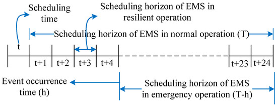The three possible operation modes of the proposed hybrid microgrid are normal mode (grid-connected mode), resilient mode, and emergency mode (islanded mode). Each of the operation modes has a different scheduling horizon as depicted in Figure 5. The scheduling horizon for normal mode is 24 h (T) and operation is based on the day-ahead model. If the BESS operation controller decides to be in resilient mode, the EMS also switches its mode to resilient mode. The scheduling horizon for resilient mode is one hour (t). The BESS operation controller determines its operation mode at each time interval; therefore, scheduling horizon of the resilient mode is taken as one hour in this study. If any event occurs at time h, the EMS will switch its operation mode to emergency mode. The scheduling horizon of the emergency mode is from t = h to the end of the day (T), i.e., T-h. If the event is cleared, the EMS will switch back to normal/resilient operation mode depending on its input values. Generally, a scheduling horizon of 1 day is considered for scheduling of microgrids [6,8,21]. Therefore, in this study also, simulations are conducted for one day. However, the formulated mathematical models can be used to extend the simulations for longer durations by iterating the scheduling window.
