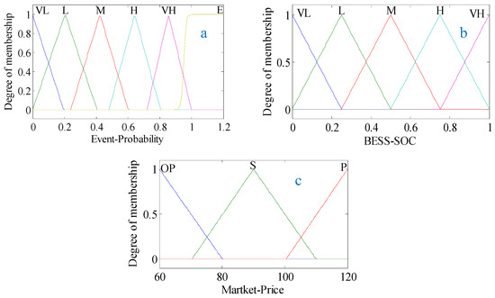 Membership functions: (a) event probability; (b) BESS SOC; (c) market price signals.