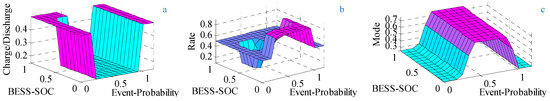 Control surfaces for BESS operation controller corresponding to event occurrence probability and BESS SOC: (a) charging/discharging mode; (b) charging/discharging rate; (c) BESS operation mode.