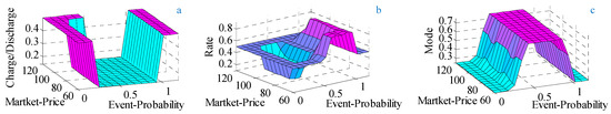 Control surfaces for BESS operation controller corresponding to event occurrence probability and market price: (a) charging/discharging mode; (b) charging/discharging rate; (c) BESS operation mode.