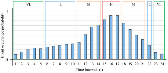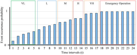 In emergency mode also, two cases are simulated. In the first case, The BESS is always fully controlled by the EMS, which is named the conventional approach. In the second case, the BESS operation controller decides the operation mode (resilient or subservient) of the BESS, which is named as proposed strategy. The simulated scenario for evaluating the performance of proposed strategy in emergency mode is shown in Figure 13, where interval-wise event occurrence probability is shown.