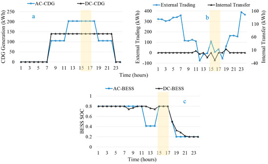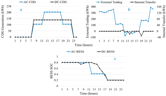 It can be observed from Figure 11a that the generation amount of CDGs is controlled by the market price signals. During off-peak intervals, CDGs are set to minimum and demand is fulfilled by buying electricity from the utility grid in order to minimize the microgrid’s operation cost. In peak price intervals, CDGs are set to maximum and surplus is sold to the utility grid to increase the profit. External trading is increasing during off-peak intervals due to buying of more electricity from the utility grid as depicted in Figure 11b. However, internal transfer (between AC and DC microgrids) can be seen during peak price intervals to avoid external trading. BESS units are charged during the off-peak intervals and are discharged during the peak price intervals as depicted in Figure 11c. The BESS is used either to fulfill the local demand of microgrid or to trade power with the utility grid.