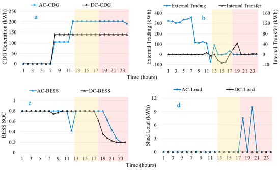 The system was in grid-connected mode during time intervals 1–17. Due to a system disturbance event, operation mode of the system has changed to islanded mode in time interval 18 and remained in islanded mode until the end of the day (24 h), as highlighted in Figure 14. During grid-connected mode, generation of CDGs is controlled by the market price signals as shown in Figure 14a. However, during emergency mode, CDGs generate maximum power to minimize load shedding. External trading is not possible during islanded mode as shown in highlighted portion of Figure 14b. In the case of conventional approach, system resiliency is not considered and the BESS is discharged during peak price intervals to increase profit as shown in Figure 14c. However, when the system is switched to emergency mode, load shedding is carried out in all the intervals in both AC and DC microgrids, as shown in Figure 14d.