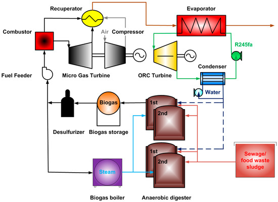 This study analyses the performance of an MGT/ORC system for utilizing biogas from sewage sludge and food waste. The objective of this study is to clarify the relationship between the scale of a plant and the optimal size of the MGT and ORC. The performance of the MGT is determined based on a commercial Capstone C1000 unit, and a recuperator is considered to improve the system performance. An ORC system with a turbine is used for efficient recovery of the waste heat produced by the exhaust gas of the MGT. Cooling water from the condenser outlet is considered as a heat source for the digesters. The proposed systems are modeled based on the mass and energy balances.