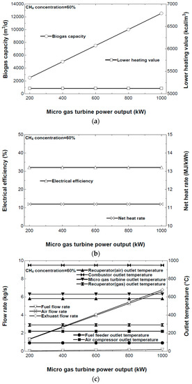 The effect of different sizes of the micro gas turbines on the required operating conditions. (a) The biogas capacity per day and the lower heating value of the biogas; (b) The electrical efficiency and the net heat rate of the MGT; (c) The mass flow rate and the outlet temperature for the streams in the MGT.