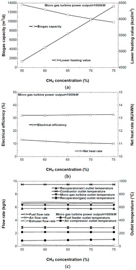 The effect of CH4 concentration on the performance of the micro gas turbine. (a) The required biogas capacity per day and the lower heating value of the biogas; (b) The electrical efficiency and the net heat rate of the MGT; (c) The mass rate and the outlet temperature for the streams in the MGT.