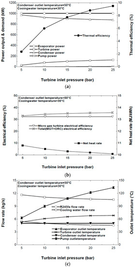 Figure 5b shows that the electric efficiency of the MGT/ORC increased a little when the turbine inlet pressure of the ORC increased. In contrast, the net heat rate decreased slightly. Figure 5c shows that the R245fa flow rate and cooling water decreased slightly as the turbine inlet pressure increased. This occurred because the higher turbine inlet pressure leads to more specific net work done and more specific evaporator heat input. Most of the outlet temperatures except at the condenser increased within the turbine inlet pressure range of 5–25 bar.