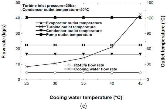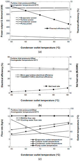 Figure 6b shows that the electric efficiency decreased a little when the condenser outlet temperature of the ORC increased, but the net heat rate increased slightly. Figure 6c shows that the R245fa flow rate increased slightly, but the cooling water flow rate decreased considerably as the condenser outlet temperature increases. The higher condenser outlet temperature decreases the specific net work done but increases the specific condenser heat input. The turbine outlet temperature increased within the condenser outlet temperature range of 50–90 °C.