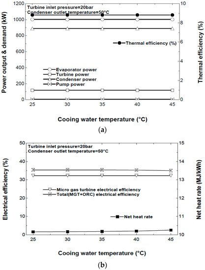 Figure 10b shows that the electrical efficiency and net heat rate are equal to those in Figure 9b. These results occur because parameters are the same. Figure 9c shows that the exhaust gas flow rate varied according to the MGT power output. The ORC system outlet temperature did not change at all. The condenser outlet temperature is fixed at 50 °C for the digester heating demand.