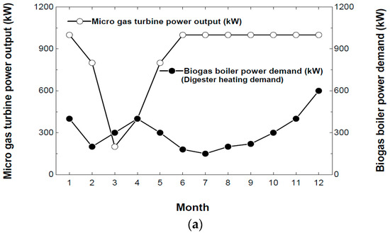 The base case is used for reference and corresponds to the current situation. In this situation, biogas is partially burned in a boiler to heat the first digester, which is enough to supply the heat required during all four seasons (Table 7). The rest of the biogas production can be consumed in a 1000-kW MGT that would run continuously at full load or partial load. The MGT is sensitive to the ambient temperature, which can influence the net power and thermal efficiency.
