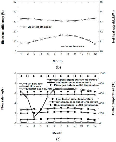 Annual operating results for MGT with biogas boiler system. (a) The power output of the MGT and the amount of the biogas used in the biogas boiler; (b) The electrical efficiency and the net heat rate of the MGT; (c) The mass rate and the outlet temperature for the streams in the MGT.