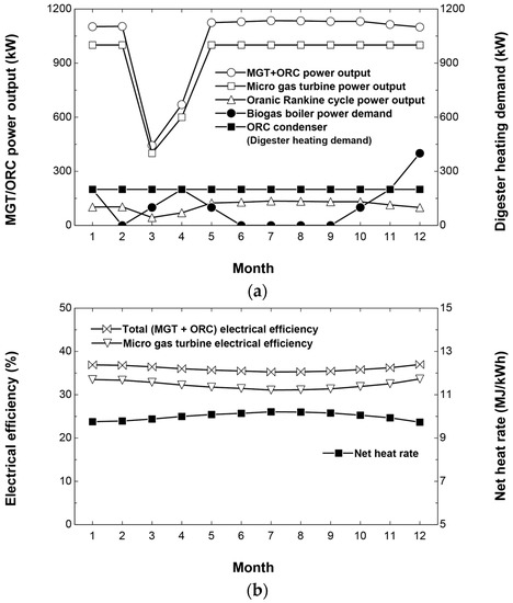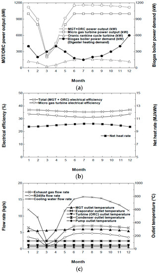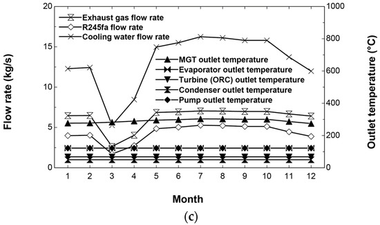 Figure 9 shows the annual operating results of the MGT with the bottoming ORC. Figure 9a shows that the ORC system produced the highest power output during summer due to the high mass flow rate of the exhaust gas (Figure 9c) and the low required heat for the biodigester. Figure 9b shows the electrical efficiencies for the MGT and MGT/ORC systems. The MGT/ORC system has 3% higher efficiency throughout the year due to the additional heat recovery. The performance of MGT was decreased in summer due to increased compression work, and the combined system also showed a similar tendency. Figure 9c shows that the operating parameters of the ORC system did not change because the mass flow rate of the ORC cooling water changed instead.