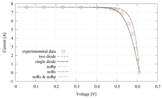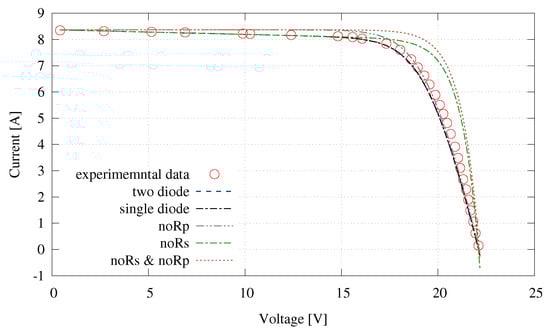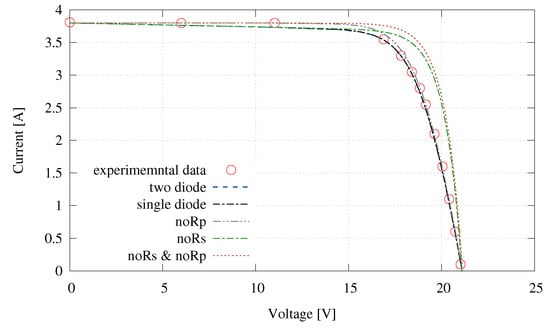 The experimental (I, V) points were extracted from the manufacturer’s datasheet of each panel and compared with the simulated data obtained while varying the complexity of the PV model. Table 1 shows both the parameters extracted from the datasheet and obtained during model adjustment which are used in the PV array simulations. Notice that for the two diodes, model and are set to be equal in magnitude and they have been calculated at standard temperature conditions using Equation (7) reported in the work of Villalva et al. [19]. The diffusion current , in accordance with Shockley’s diffusion theory, has been set equal to unit, while the value of has been chosen by means of numerical fitting according to the methodology adopted in previous work [20,45]: the value has been iteratively adjusted in order to find the best match between the model and the experimental Several I–V curve.
