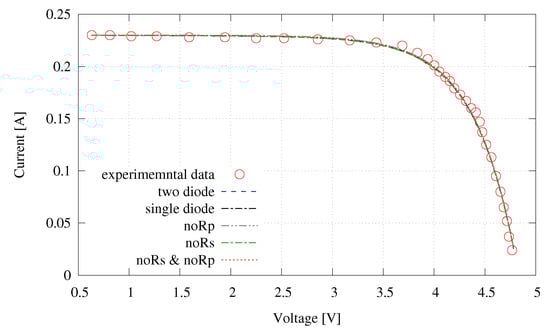 On one hand, this is an ideal representation of a solar panel and, as such, it can be exploited for reasoning only on some basic, theoretical concepts related to PV arrays. On the other hand, it provides a useful comparison term to be included in our study, because of the low number of parameters to be obtained for its derivation (, , a), and because of the simple structure of the Several I–V equation which allows significant savings in term of execution time. In light of these considerations, it can be taken as a lower bound for computational complexity.