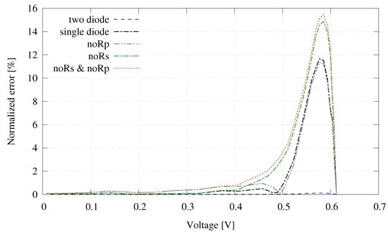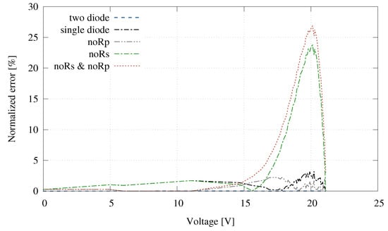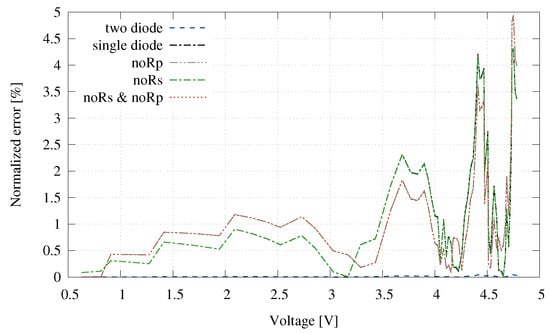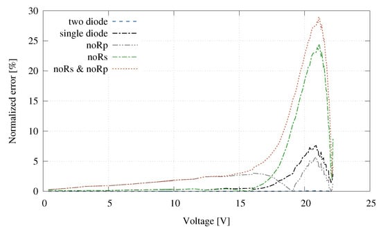 Figure 7, Figure 8, Figure 9 and Figure 10 show the normalized error calculated while reconstructing the Several I–V curves of Figure 3, Figure 4, Figure 5 and Figure 6. Notice that, to directly compare different PV array modules characterized by different dynamic ranges, the measured errors have been normalized with respect to the . As expected, the higher the provided by the PV array, the higher the approximation error measured while reducing the model complexity. For instance, KD135SX and MSX60, which are high current modules, show a maximum normalized error around 30% while removing the series, or both series and parallel resistances from the model. On the other hand, for a medium-current PV array such as the Q6ML-1600, the maximum normalized error never exceeds 16% and for the low-voltage/low-current MC-SP-0.8 PV array, the maximum measured error obtained while removing both the series and the parallel resistances is extremely reduced and it remains always under a threshold of about 5%.