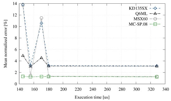 Figure 11 shows the Pareto curve of the execution time vs. the MNE, obtained for each PV array. The orthogonal red dotted lines define a region in which the PV array can be emulated using the embedded hardware without impairing the emulation performance. In fact, in this region, the MNE is always lower than 5% (a threshold set to ensure reasonably accurate emulation) and the execution time never exceeds the hardware emulator latency, which has been estimated to be about 172 μs on average (see [17]). Thus, each point pair (model configuration, PV array) which falls inside the region can be suitably emulated by the embedded device. For instance, the KD135SX PV array can only be emulated in the configuration with a single diode without parallel resistance while all other configurations fall outside of the region. On the other hand, a low-current and low-voltage PV array such as the MC-SP.08, which is a module traditionally used to power wireless sensor nodes, shows a Pareto curve which is almost a horizontal line so that all three of the simplest model configurations can be used to emulate the PV array.