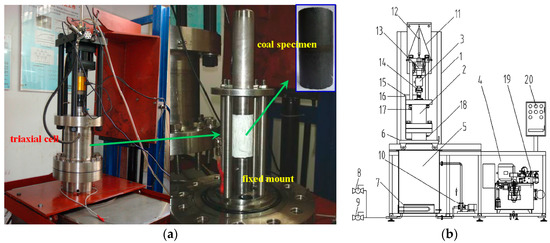 “THM coupled with triaxial servo-controlled seepage apparatus for gas infiltrated coal” [18] is used for our experiments (Figure 1). The device includes a servo loading system, pressure chamber, constant temperature oil heating system, gas pressure control system, data acquisition and storage system, and auxiliary system. The technical specifications of this apparatus are as shown in Table 1. This apparatus is applicable to investigate the combined effect of stress, strain, temperature, and gas flow on the mechanical behavior and permeability of coal specimens [19].