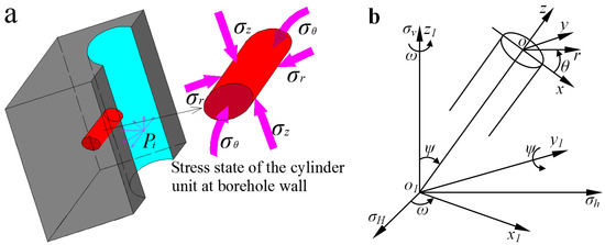 Stress state of the wellbore unit: (a) the formation unit; (b) the conversion of coordinates for an inclined wellbore.