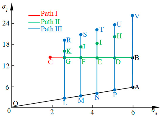 Stress Path II (UCP-RAS test): there are four stages for these tests. Stages 1 and 2 are the same as Stress Path I. Stage 3: UCP tests are conducted to the confining pressures of 5.24 MPa (D), 4.48 MPa (E), 3.72 MPa (F), and 2.6 MPa (G), respectively, with the unloading rate of 0.02 MPa/s. Stage 4: the axial stresses are continuously increased at a loading rate of 0.05 kN/s until the specimens fail under the current confining pressure.